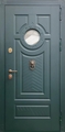 Стальная дверь с круглым стеклом, кнокером и зелеными панелями МДФ RAL (терморазрыв)